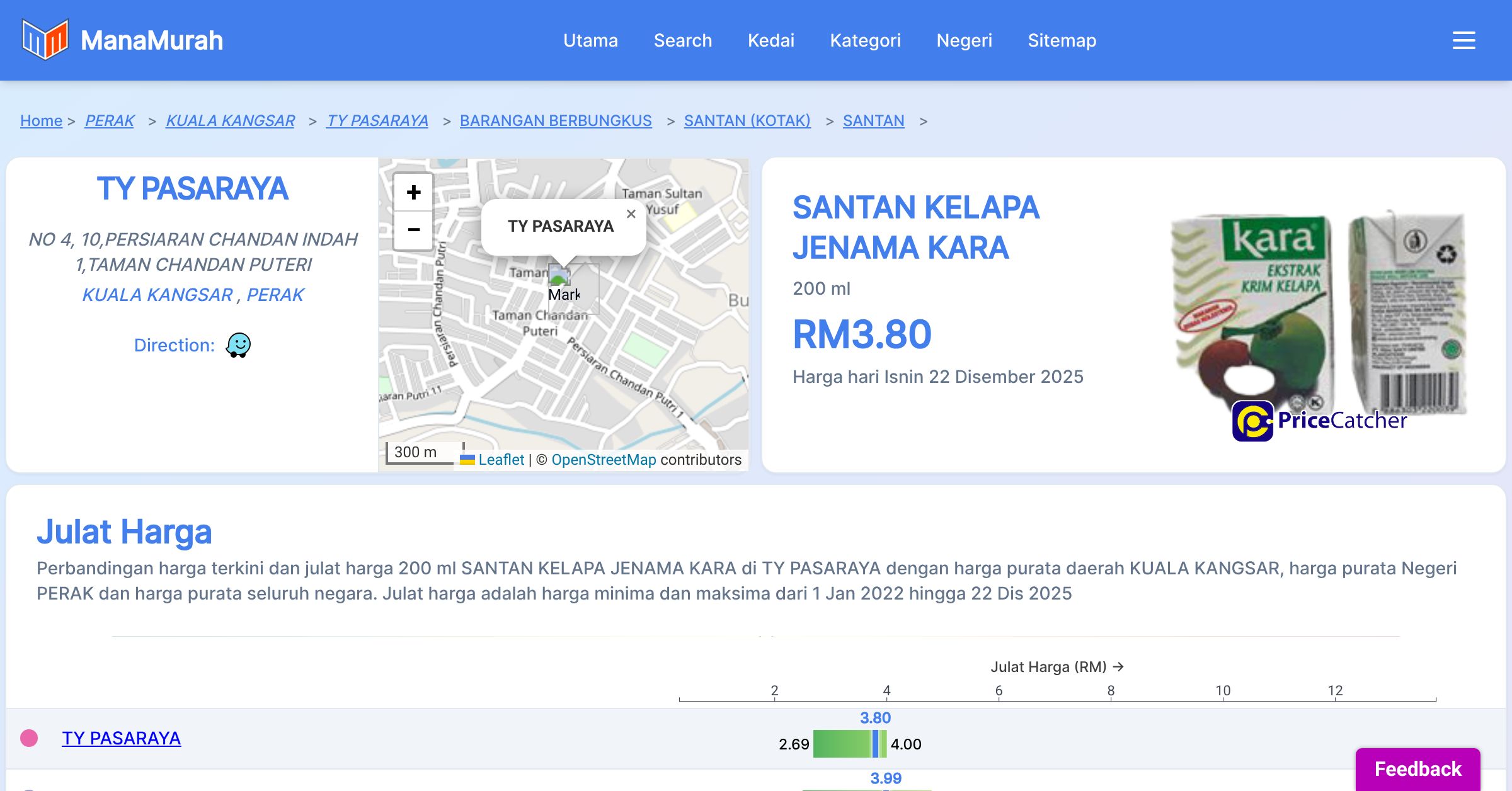 Perbandingan harga terkini dan julat harga 200 ml SANTAN KELAPA JENAMA KARA di TY PASARAYA dengan harga purata daerah KUALA KANGSAR, harga purata Negeri PERAK dan harga purata seluruh negara. Julat harga adalah harga minima dan maksima dari 1 Jan 2022 hingga 22 Dis 2025