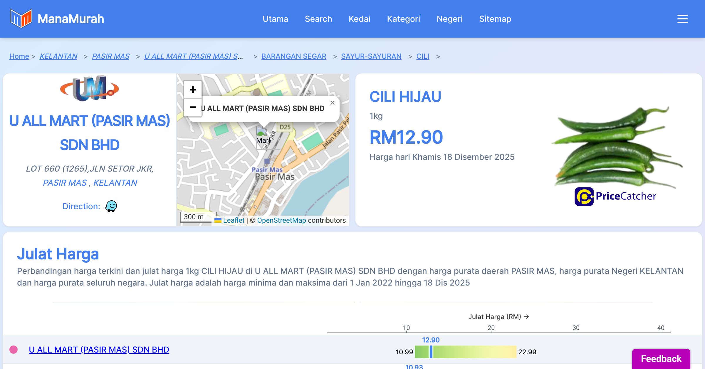 Perubahan harga purata mingguan 1kg CILI HIJAU di U ALL MART (PASIR MAS) SDN BHD berbanding harga purata mingguan daerah PASIR MAS, harga purata mingguan negeri KELANTAN dan harga purata mingguan seluruh negara sehingga 18 Dis 2025