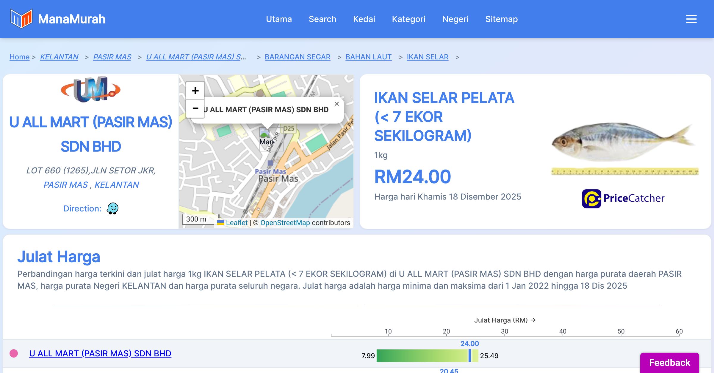 Perbandingan harga terkini dan julat harga 1kg IKAN SELAR PELATA (< 7 EKOR SEKILOGRAM) di U ALL MART (PASIR MAS) SDN BHD dengan harga purata daerah PASIR MAS, harga purata Negeri KELANTAN dan harga purata seluruh negara. Julat harga adalah harga minima dan maksima dari 1 Jan 2022 hingga 18 Dis 2025
