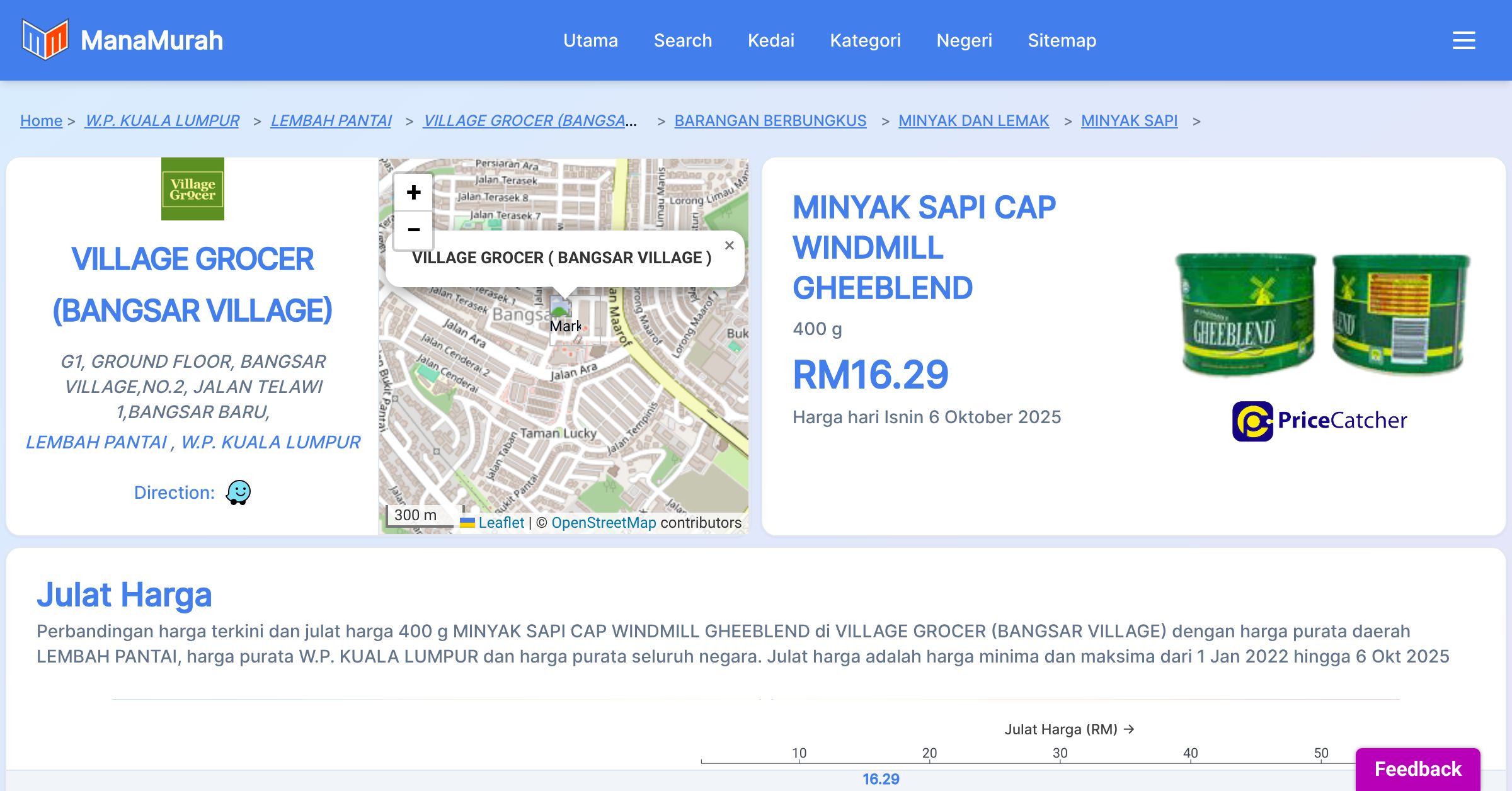 Perubahan harga purata mingguan 400 g MINYAK SAPI CAP WINDMILL GHEEBLEND di VILLAGE GROCER ( BANGSAR VILLAGE ) berbanding harga purata mingguan daerah LEMBAH PANTAI, harga purata mingguan negeri W.P. KUALA LUMPUR dan harga purata mingguan seluruh negara sehingga 6 Okt 2025