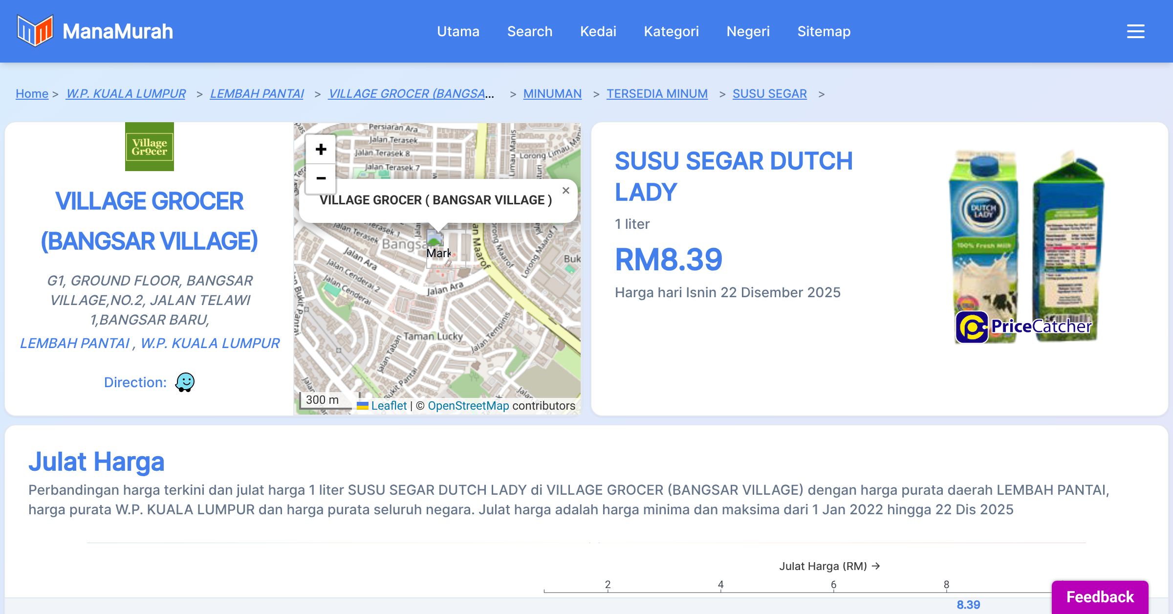 Perubahan harga purata mingguan 1 liter SUSU SEGAR DUTCH LADY di VILLAGE GROCER ( BANGSAR VILLAGE ) berbanding harga purata mingguan daerah LEMBAH PANTAI, harga purata mingguan negeri W.P. KUALA LUMPUR dan harga purata mingguan seluruh negara sehingga 22 Dis 2025