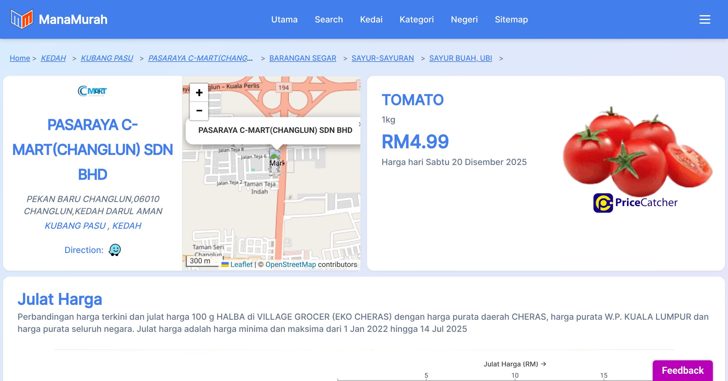 Perbandingan harga terkini dan julat harga 100 g HALBA di VILLAGE GROCER (EKO CHERAS) dengan harga purata daerah CHERAS, harga purata W.P. KUALA LUMPUR dan harga purata seluruh negara. Julat harga adalah harga minima dan maksima dari 1 Jan 2022 hingga 14 Jul 2025