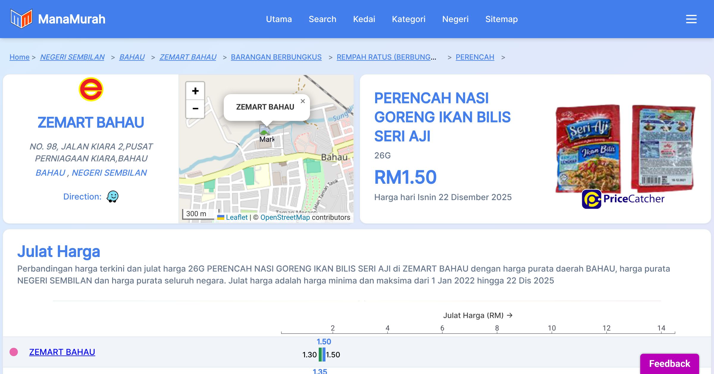 Perbandingan harga terkini dan julat harga 26G PERENCAH NASI GORENG IKAN BILIS SERI AJI di ZEMART BAHAU dengan harga purata daerah BAHAU, harga purata NEGERI SEMBILAN dan harga purata seluruh negara. Julat harga adalah harga minima dan maksima dari 1 Jan 2022 hingga 22 Dis 2025