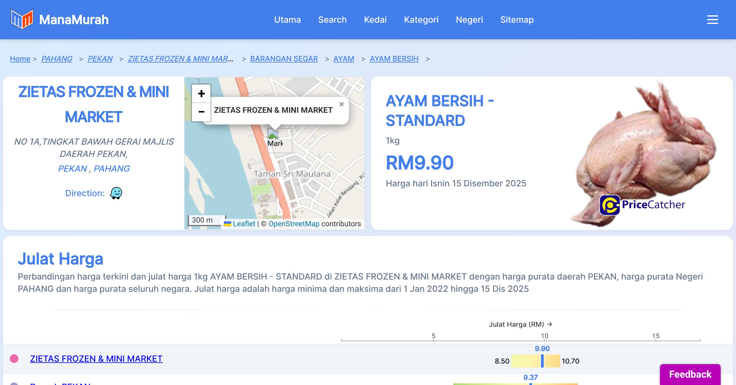 Perbandingan harga terkini dan julat harga 1kg AYAM BERSIH - STANDARD di ZIETAS FROZEN & MINI MARKET dengan harga purata daerah PEKAN, harga purata Negeri PAHANG dan harga purata seluruh negara. Julat harga adalah harga minima dan maksima dari 1 Jan 2022 hingga 14 Dis 2025