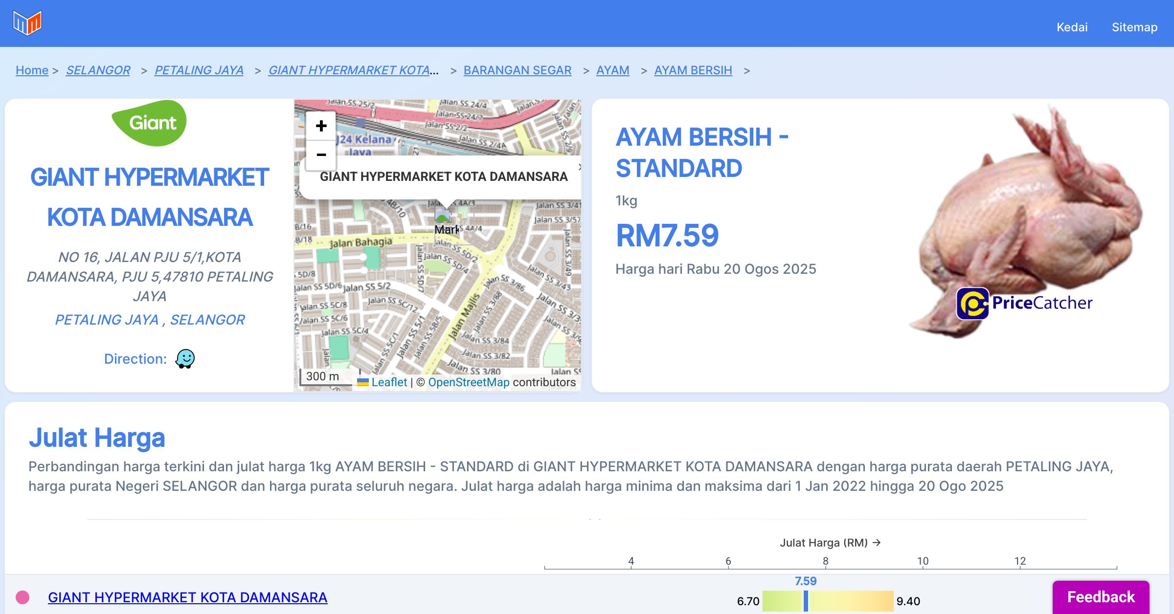 Harga purata tahunan 1kg AYAM BERSIH - STANDARD di GIANT HYPERMARKET KOTA DAMANSARA berbanding harga purata daerah PETALING JAYA, harga purata Negeri SELANGOR dan harga purata seluruh negara