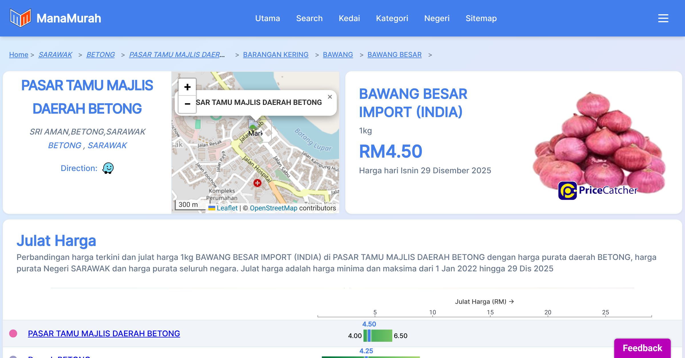 Perbandingan harga terkini dan julat harga 1kg BAWANG BESAR IMPORT (INDIA) di PASAR TAMU MAJLIS DAERAH BETONG dengan harga purata daerah BETONG, harga purata Negeri SARAWAK dan harga purata seluruh negara. Julat harga adalah harga minima dan maksima dari 1 Jan 2022 hingga 29 Dis 2025